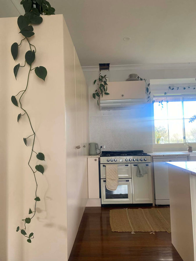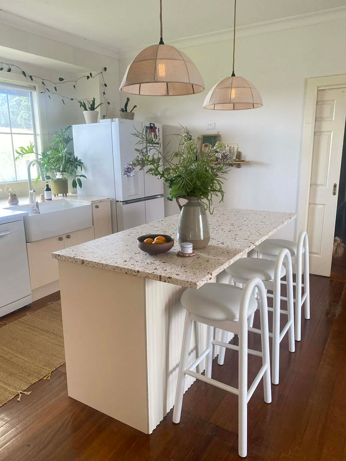 Key elements include the stunning Carmelita Terrazzo benchtop from Fibonacci, Kaboodle joinery painted in Unbleached Calico Half, mushroom ceramic pebble knobs from Lo & Co, Artusi Vintage Freestanding Oven, Ceramic Farmhouse sink from Temple & Webster and Valentine counter stools from P & R Styling. For more, shoot me a message, I would be more than happy to have a chat.
